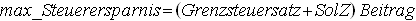 - Man kann nicht mehr Steuern sparen, als man tatsächlich zahlt! Reduziert man das zu versteuernde Einkommen z.B. durch Einzahlung in ein Produkt zur Altersvorsorge, so ist für die Ersparnis der Grenzsteuersatz (bei einem zu versteuernden Einkommen von €52152 bis €250000 z.B. derzeit 42%) plus 5,5% Solidaritätszuschlag (im Beispiel also insgesamt 44,3%) maßgebend. Es gilt also etwa:
