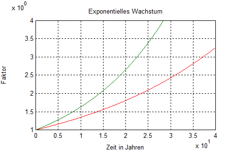 Ein jährliches prozentuales Wachstum der Wirtschaft wird von Wirtschafts-"Experten" und anderen Wichtigtuern als absolut erstrebenswert propagiert. Wer das tut, hat offensichtlich das Wesen der Exponentialfunktion nicht verstanden. Das folgende Bild zeigt beispielhaft für ein Wachstum von 3% (rot) bzw. 5% (grün), wie sich die Wirtschaft entwickeln würde: