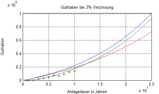 Die rote Kurve entspricht der Summe der Beiträge (5% Dynamik). Die blaue Kurve zeigt die Wertentwicklung eines Tagesgeldkontos bei einer Verzinsung mit 3% zum Vergleich. Die grüne Kurve entspricht der blauen Kurve, wobei die Kosten für Vertrieb und Verwaltung abgezogen wurden. Die schwarzen Pluszeichen schließlich zeigen dem tatsächlichen Rückkaufswert der Versicherung.